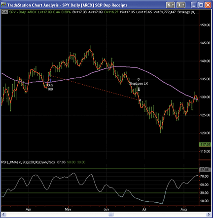 To download the EasyLanguage code for the function, indicator, and strategy, go to the TradeStation and EasyLanguage Support Forum (https://www.tradestation.com/Discussions/forum.aspx?Forum_ID=213) and search for the file “TradingWithHullMovingAverage.eld.”
