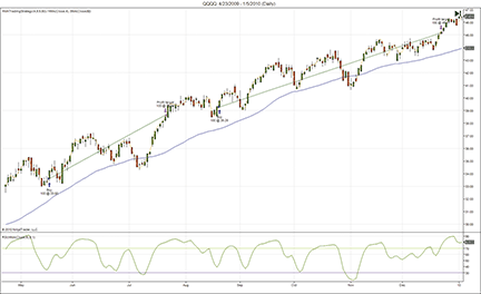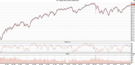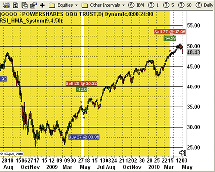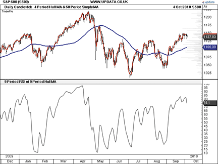 Figure 21: CHARTSY, HULL MOVING AVERAGE SYSTEM. This sample chart shows the RSI 9 of HMA(9) as an indicator, and the HMA(4) and SMA(50) as overlays.