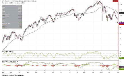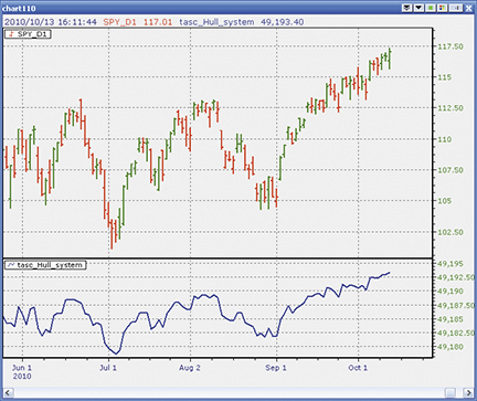 Figure 1: TRADESTATION, HULL MOVING AVERAGE. Here is a sample daily bar chart of SPY ETF displaying the indicator “_Hull moving average” (red plot, four-bar length). The magenta plot is a 50-bar simple moving average of the close. In the subgraph is the built-in RSI indicator plotting the nine-bar RSI of the nine-bar HMA as described in Max Garner’s article.