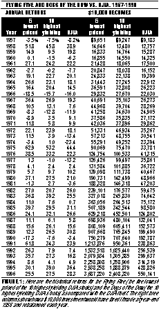 Studying Figure 1 reveals a pattern of tremendous consistency as well as profitability. The Flying Five had only eight losing years (versus 10 for the DJIA), but only two of these losses were double digit (-18.5% in 1966 and -17.3% in 1990). In this regard, the 10 highest-yielding did even better, with only seven losing years (two of which were double digit). In contrast, four of the DJIA's losing years were double digit, including a bruising 23.4% loss in 1974. The irony of investing in the Dogs of the Dow or the Flying Five is that you get dramatically greater returns with substantially less risk.