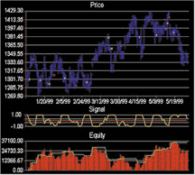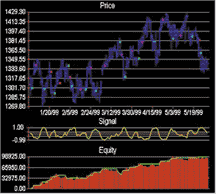 After three generations of models had been built, the difference between the equity curves was already apparent. Figures 3 and 4 depict the price of the S&P 500 futures contract from 1/2/1999 to 6/1/1999, with the red dots indicating the price where the model took a short trade, and the blue dots indicating the price where the models took a long trade. The center plot on the graph is the output of the neural network--when it crosses zero, a trade is entered or exited. The bottom plot is a graph of open equity, whereas the thin line indicates the closed equity. For simplicity's sake, no money management was used in either model, and only one contract was bought or sold for each trade.