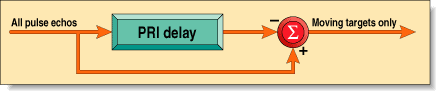 Many radar systems, such as those used in air traffic control, are only used in relation to moving targets; these radars use a circuit called a moving target indicator (MTI). There are several ways to implement MTI, but the simplest way is to use the previous echo from a fixed target to cancel out the current echo from that same target. Figure 1 is a block diagram that shows how this cancellation is accomplished. The delay line delays the echo from the previous pulse by exactly one pulse repetition interval. Thus, pulses from fixed targets appear at exactly the same time and are canceled out, whereas pulses from moving targets do not occur at exactly the same time from pulse to pulse, and therefore are not.