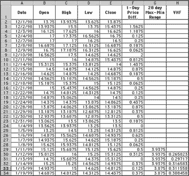 As shown in sidebar Figure 1, the first step is calculating the absolute value of the one-day price change. This is performed in column F. The formula for cell F3 is:=(ABS((E2-E3)))