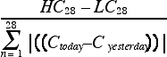 where the numerator is the difference between the highest close and the lowest close for the last 28 days and the denominator is the 28-day sum of the absolute value of the one-day price change.