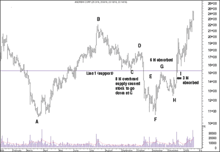 FIGURE 1: ANDREW CORP. Andrew supporters accumulated 8 million shares around C but became sellers when support was broken. Subsequent moves up could not succeed until that supply had been absorbed at G and I.