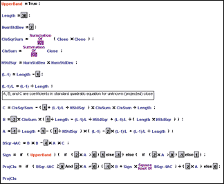 GO BACKWe have provided an exact solution for the Bollinger Band problem discussed by Benjamin Cotton in "Bollinger Band Targets" in this issue. In the article, Cotton presents a technique to calculate the future price movement necessary to cross a moving standard deviation band condition such as a Bollinger Band. Our solution, the BollingerBandTarget (BBT) formula, is shown in Figure 5. Traders trying to design mechanical systems based on the BBT will really appreciate the better program-testing speed achieved when using an exact solution.