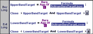 Figure 8 shows an alternative system using our Bollinger Band targets, with the bands acting more like an overbought/oversold oscillator-based system. This countertrend system will improve performance in trading range markets, but often works poorly in trending markets. The system enters and exits on an intraday basis at the BBT target prices instead of waiting for the close. Excluding price gaps through the BBT bands, it buys on limit orders at the lower BBT band and sells using a limit order at the upper band. You may wish to use a "Round" icon to set buy and sell prices at exact tick values for the markets you trade. Signal timing from the trend and countertrend systems are roughly inverted. You will often find that the percentage of winning trades in the countertrend system will be much higher, but the ratio of average profit to average loss really suffers. We wanted to point out another way of looking at how to use the bands and the projected BBT formula.