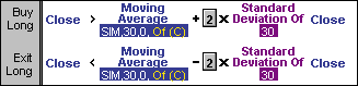 This is similar to using a Bollinger Band breakout method to enter, but it gets you in earlier because the long entry stop anticipates the potential breakout. You may find that your results will improve by varying the parameter values (as with most trading systems). If you own NeuroShell Trader Professional, you can use the Genetic Optimizer to help determine the best parameters.