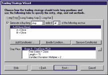 Select "New Trading Strategy É" from the Insert menu and enter the following entry/exit conditions in the appropriate locations of the Trading Strategy Wizard: