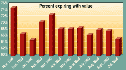 Having been an arbitrage trader for a number of years -- and hence having had a large number of both put and call options in position at every expiration during those years -- the rumors of how many options expired worthless seemed way too high to me. So beginning November 1999, I started keeping specific track of just how many options expired worthless each month. To do this, I used the final bid-ask quote of the option on expiration day. If there was a bid of at least 5/8 point (0.625), then I considered that option as not having expired worthless. The reason I used 0.625? It is the amount by which an option must be in-the-money in order for the Options Clearing Corp. (OCC) to automatically exercise it.The specific monthly figures can be seen in Figure 1. The bottom line is that, during this period, about 68% of all options expired with some value! So only about 32% expired worthless -- a far cry from the preposterously inflated figures that are often bandied about.