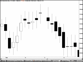 FIGURE 1: DOW JONES INDUSTRIAL AVERAGE, CANDLESTICK CHART. Formation at the peak: tohbo or tonbo? Regarding the hanging man, we have to call it as it seems even though, given the upper shadow, it's not a classic formation. We agree it would normally be expected at a top, but there it is, at a bottom.