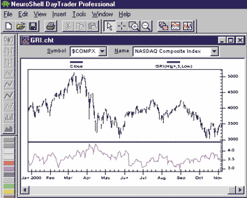 GO BACKJayanthi Gopalakrishnan's range index described elsewhere in this issue is very easy to build in NeuroShell Trader using existing standard indicators that find the highest high, the lowest low, and the log.