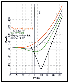 The risk curve shown in Figure 1 shows a 1x2 ratio backspread on the QQQs, created by shorting the 30 strike calls and buying the 33. The colored lines represent various time intervals during the course of the trade, beginning with today (red line) to expiration (black line).