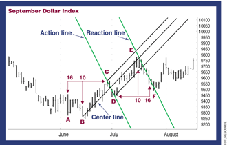 FIGURE 1: PREDICTING FUTURE SWING POINTS. By constructing action/reaction lines and by reverse counting price bars, it is possible to predict where the next high and low of the swing will take place.