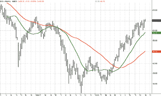 As measured by the Russell 1000 Value Index iShare (IWD), large-cap value stocks have outperformed their large-cap growth peers - even if they have not performed as well as small-cap value stocks - since the spring 2003 lows. Large-cap value stocks briefly broke out above their 20-week moving averages in the rally coming off the September 11, 2001, lows, but by spring 2002 these stocks were once again well within a bear market. Large-cap value stocks late in October and November 2003 broke out of a brief, summer-long consolidation, and now looked poised to test the highs of the earliest months of 2002.