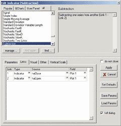 Apply the "subtract" indicator to haOpen, enter "haDiffCo" in the Label entry. At the Link tab of the "Add indicator" window, change link 1 to haClose and link 2 to haOpen (Figure 12). The result is the difference between haClose and haOpen.