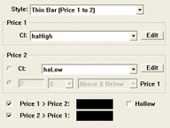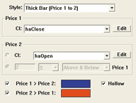The heiken-ashi candles are implemented using two price band indicators (one for the body and one for the candle wicks). The body is drawn using the price band preferences shown in Figure 14. The candle wicks are drawn using the price band preferences shown in Figure 15.