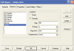 Creating historical heikin-ashi datafiles Step 1: Create a list named HEIKIN.LST of the required stocks or indices for which to create historical datafiles. For example: S&P 500, gold, US dollar index, a stock, and so on (use "File, New List" from the menu) (Figure 16). Step 2: Next create a Filter Report (Figure 17) named HEIKIN.ASHI with the following formulas or columns: FIGURE 17: TECHNIFILTER PLUS: FILTER REPORT. Add the formulas to create the ha_Open, ha_High, ha_Low, and ha_Close indicators.Filter Report FORMULAS [1] Symbol [2] haOpen (Recursive, Multiline formula Initial value O) [1]: (O+H+L+C)/4 {haClose} [2]: O*TY1/O {r} [3]: (([1]Y1+[2])/2) [3] haHigh ((O+H+L+C)/4)%[2]%H [4] haLow ((O+H+L+C)/4)#[2]#L [5] haClose (O+H+L+C)/4 [6] Vol V [7] Nil (Recursive, Multiline formula Initial value O) [1]: (O+H+L+C)/4 {I2} [2]: O*TY1/O {r}