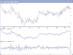 The heiken-ashi technique discussed in Dan Valcu's article "Using The Heikin-Ashi Technique" can be implemented in Investor/RT using two indicators: price bands and custom indicators. The chart in Figure 13 displays the heiken-ashi candles in the top pane, the raw candles (or Msft) in the middle pane, and the haDiffCo indicator (along with a three-period smoothing of haDiffCo) in the lower pane.
