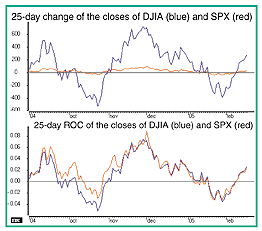 For example, compare the two panes of Figure 1. The top pane illustrates the 25-day change of the closes of the Dow Jones Industrial Average (DJIA) and the Standard & Poor's 500 (S&P). The price differences of the respective indexes make comparison almost impossible. The lower pane shows the indexes compared on the basis of their 25-day ROCs, which is considerably more useful than the top pane.