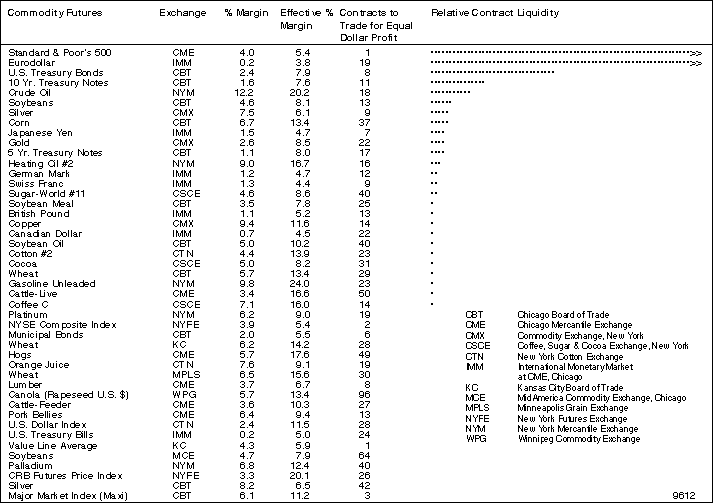 All futures listed are weighted equally under "contracts to trade for equal dollar profit." This is done by multiplying contract value times the maximum possible change in price observed in the last three-year period. Thus, all numbers in this column have an equal dollar value.