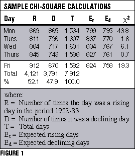 Overall, there were more rising days than declining days, so the expectation isn't even money. Rising days were 52.1% of the total, so the expectation for rising days in each day of the week is 52.1% of the total for each day. Similarly, Ed = 47.9% of T.