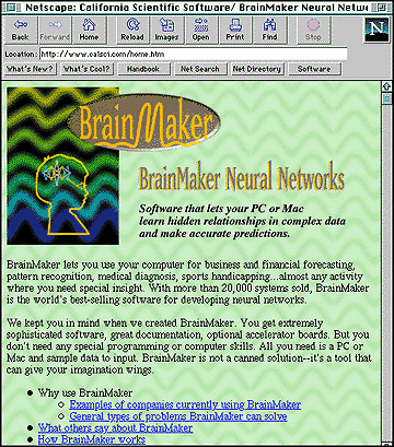 BrainMaker/32 includes sample neural networks to show the user how to construct a variety of applications. No programming knowledge is required to use BrainMaker. The software can interface with spreadsheets, databases and word processing programs for faster data preparation.