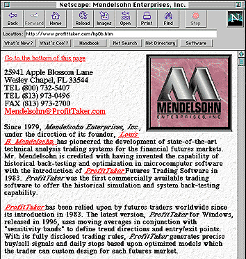 FYI -- Mendelsohn Enterprises, a provider of intermarket analysis and neural network software for the financial futures markets, has launched a Web site. The site offers articles written by software developer Lou Mendelsohn and offers products for sale, including Mendelsohn's VantagePoint and ProfitTaker software.