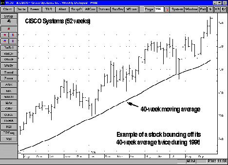 "My favorites are the 40-week and the 10-week. One of the minimum requirements I have, if we're going to recommend buying an industry group or any stock, is that the price has to be above its 40-week moving average (Figure 5)."