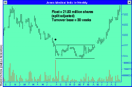 Here's a close look at the turnover of a stock's float, based on an idea from the works of W.D. Gann, that reveals some dramatic patterns and expands the definition of a base or consolidation zone."The floating supply of shares -- or simply, float -- is all of the shares actually available for trading by the public that are not owned by the company's management. This number can be incorporated into an understanding of the direct relationship between the stock price and its volume of shares traded. This is easily seen when a backward cumulative count of the volume is studied in relation to a stock's floating supply of shares. What emerges from this analysis are price-volume patterns that clearly show stocks forming bottoms, bases in a rising trend, and tops, as well as giving buy and sell signals."