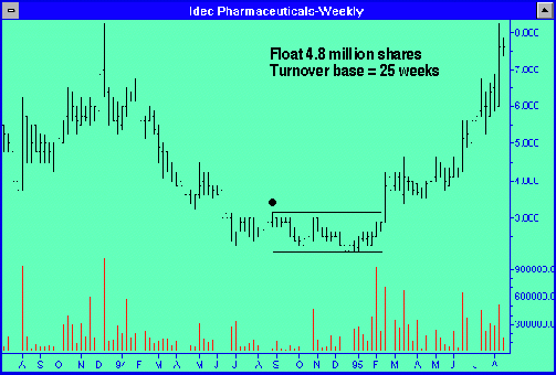 "In the next five months, the stock went from the $6 range to the $11 range. This pattern of stocks going through one complete turnover right before their prices rise is not uncommon. Other examples to study that follow the same pattern are Idec Pharmaceutical Corp. (Idph) presented in Figure 2 and Greyhound Lines (Bus) in Figure 3."