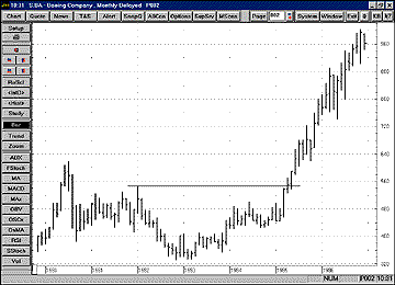 Figure 1: Boeing [BA], June 1995. Acampora listed more than 150 chart examples in his June 1995 report, Dow 7000. Seven of his examples are stocks that are listed in the Dow Jones Industrial Average. The following figures represent a "Where were they then and where are they now" view. Here, Boeing, after bottoming in late 1992, began an uptrend that returned prices to the 1990 peak. Figure 2: Boeing, December 1995. The bull trend continues in Boeing. Recently, Boeing traded above $100 before backing off. "A chart is a chart is a chart. You're measuring supply and demand. You're measuring psychology. And they never change. Now you can call a crossover on a moving average a golden cross; you can call it whatever you want. It's still the same thing. That's what makes it so exciting. It's the only financial subject that is consistent from country to country. You can't say that about fundamental analysis, because in fundamental analysis they do things differently in different countries, but you can say that about technical analysis. That's what makes technical analysis so flexible.