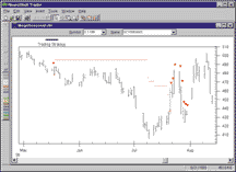 FIGURE 4: NEUROSHELL TRADER. Here's a NeuroShell Trader chart that graphically displays the trailing stop prices for the megaseasonal system. |