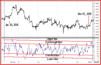 FIGURE 1: HOURLY CHART OF THE BRITISH POUND. The four lines are applied on the oscillator. The indicator oscillates between the inner lines.The two extreme lines limit the range of RSI values. The slant of these lines is valuable information because it indicates certain changes have taken place inside the market. Range boundaries can sometimes be directed downward when the market consistently goes up, or vice versa. This suggests something is taking place inside the market that has not yet revealed itself.