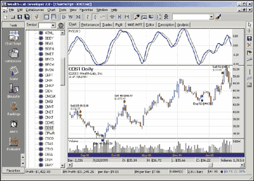 TradeStation (TradeStation Technologies), MetaStock (Equis International), NeuroShell Trader (Ward Systems Group), TradingSolutions (NeuroDimension), Investor/RT (Linn Software), Wealth-Lab.com (Wealth-Lab.com), TechniFilter Plus (RTR Software), NeoTicker (TickQuest), SmarTrader (Stratagem Software), Byte Into The Market (Tarn Software)
