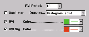 John Ehlers's article in this issue, "Relative Vigor Index (RVI)," takes an old concept and updates it with modern filters. We have added the relative vigor index to Investor/RT as a built-in technical indicator. RVI can be drawn as either a histogram oscillator depicting the difference between the RVI and RVI signal lines, or as individual RVI and RVI signal lines. Figure 3 shows the preferences available for RVI.