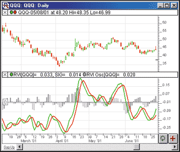When the oscillator checkbox is unchecked, you have the option of showing either the RVI line, the RVI signal line, or both. Figure 4 illustrates the use of both the oscillator and the individual lines. The upper pane shows the daily bars of QQQ. The RVI line is drawn in green while the RVI signal line is drawn in red. The lower pane depicts the Rvi and RVI signal lines overlaying the oscillator drawn as a histogram. The histogram bars represent the difference between the RVI line and the RVI signal line. The histogram color represents whether the bar was an up bar (dark gray) or a down bar (light gray). The oscillator line can be drawn as a histogram (hollow or solid) or a line (connected or continuous).