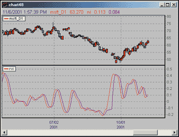 The RVI indicator is an oscillator with two plots (Figure 4), which shows Rvi and the smoothed Rvi .A version of this NeoTicker RVI script is available for download at our website. Since NeoTicker EOD 2.3 does not support multiple plots, if you are interested in using the RVI with NeoTicker EOD, you can download the EOD version of RVI from our website.