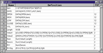 Rows 9 and 10, Value1 and Value2, are user formula rows and duplicate the filtering formulas from the article. Note, in SmarTrader, a minus (-) sign is used to point backward since the absence of a sign indicates a forward pointer.Rows 11 and 12, Num and Denom, use the sum function and substitute for the "for" loop in the language used in the article. Any change in the value of Length will be reflected in the number of periods summed for Num and Denom.