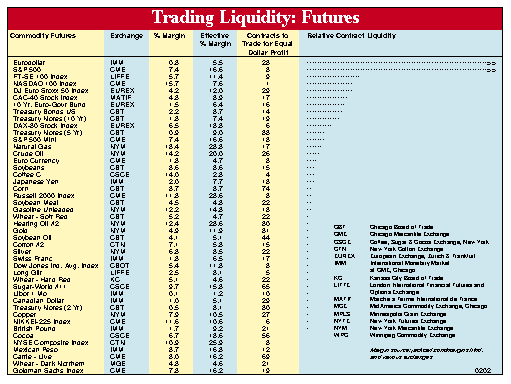 Trading Liquidity: Futures is a reference chart for speculators. It compares markets according to their per-contract potential for profit and how easily contracts can be bought or sold (i.e., trading liquidity). Each is a proportional measure and is meaningful only when compared to others in the same column. The number in the "Contracts to Trade for Equal Dollar Profit" column shows how many contracts of one commodity must be traded to obtain the same potential return as another commodity. Contracts to Trade = (Tick $ value) x (3-year Maximum Price Excursion). "Relative Contract Liquidity" places commodities in descending order according to how easily all of their contracts can be traded. Commodities at the top of the list are easiest to buy and sell; commodities at the bottom of the list are the most difficult. "Relative Contract Liquidity" is the number of contracts to trade times total open interest times a volume factor, which is the greater of: 1 or exp (1n (volume) / 1n (5000)) - 2.