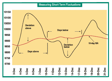 The chart displayed in Figure 1 of DJIA daily closes from December 3 to December 21, 2001, illustrates the terminology we will use in discussing results. We looked at and tabulated the number of days the DJIA spent above or below the MA, and at its maximum percentage deviation from the trendline during each period.