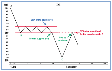 Figure 1 shows a hypothetical example of a price downswing from point A to point B, followed by a consolidation area, and finally a breakdown to point C (a classic example of a downtrend). The broken support level established during the consolidation now acts as resistance for the subsequent rally. The resistance at $60 also represents a 50% retracement of the move from A to C ($100 to $20).
