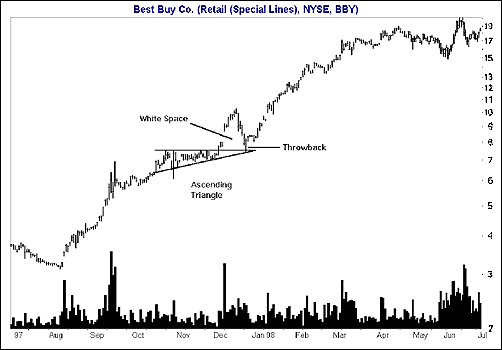 Figure 1: Throwback. A throwback completes within 30 days of the upward breakout and shows white space between the breakout and ascending triangle boundary.