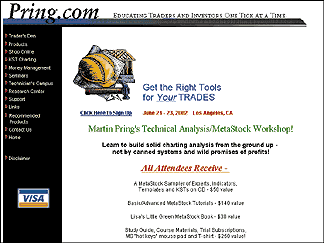 Beginning sessions will cover everything from MetaStock basics to how to use the DownLoader, printing charts, and other aspects of the program. The next day covers a wide range of technical analysis topics. Day 3 is designed to get the most out of MetaStock. Bring your laptop! Intimidating features will be explained. The last day covers power charting with MetaStock's charting features, its indicator language, and modules, as well as how to design, test, and apply mechanical trading systems. Early registration by June 3, all three days, $1,425. After June 3, all three days, $1,564. Other class packages also available. www.pring.com/seminar1.htm |