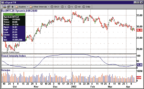 Figure 1: eSignal: Trend intensity index. Here's a sample chart of M.H. Pee's trend intensity index as seen using eSignal's latest advanced charting features.
