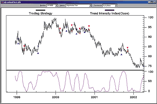 A trend intensity index system that trades when the trend intensity index is above 80 or below 20 could then be written as follows:Trend Intensity IndexShort Name: TIIInputs: Price, Sum Period, MA PeriodMult (Div (SDPlus (Price,Sum Period,MA Period), Add (SDPlus (Price,Sum Period,MA Period), SDMinus (Price,Sum Period,MA Period))),100)These functions and the accompanying system are available in a function file that can be downloaded from the TradingSolutions website (www.tradingsolutions.com) in the Solution Library section. They can then be imported into TradingSolutions using "Import Functions..." from the File menu. Figure 7 shows a sample chart.Trend Intensity Index SystemInputs: Price, Sum Period, MA PeriodEnter Long: GT ( TII ( Price , Sum Period , MA Period ) , 80 )Enter Short: LT ( TII ( Price , Sum Period , MA Period ) , 20 )