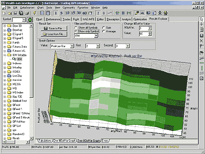 Once the optimization is complete, you can examine the results in a variety of ways using the Results Explorer. You can view the raw tabulations, or view a two-dimensional surface graph of any two optimization variables. The graph can be rotated to give you an excellent visual representation of the parameter dynamics. Figure 4 displays the graph of profit per bar for PctUp by PctDown, with the EMA period set at 60. This produced a range of profitable values centered around the 0.6 to 0.7 range for PctUp.
