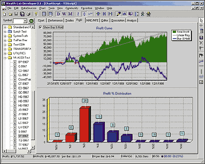 Figure 5: Wealth-Lab, trend intensity index. This shows the results of running M.H. Pee's TII system on Swiss franc continuous contract data from early 1975 through late 2000. This also displays the overall profit curve, as well as the trade profit distribution.TII works well on markets that tend to exhibit strong trends. We've tested it on a number of futures markets with encouraging results. Figure 5 shows the TII system run on Swiss franc continuous contract data from early 1975 through late 2000. One contract per position was taken, and $100 per trade was deducted for slippage and commission. Figure 5 also displays the overall profit curve, as well as the trade profit distribution.