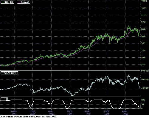 Figure 6: NeoTicker, trend intensity index. M.H. Pee's tii_system as implemented in NeoTicker returns the current equity of the system as well as reporting the test results to an opened report window.A downloadable version of the indicators will be available from the NeoTicker Yahoo! user group and the TickQuest website.