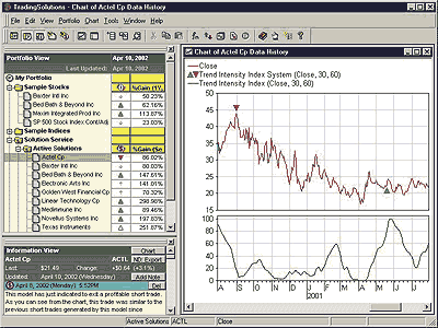 Figure 7: TradingSolutions. Here's a sample chart of the trend intensity index and system in TradingSolutions.It is also worth noting that the trend intensity index may make a good input to neural network predictions, especially in data where strong trends are present. When using it as an input to a prediction, you will typically want to set the preprocessing to "None," since the value of the trend intensity index is restricted to a limited range.
